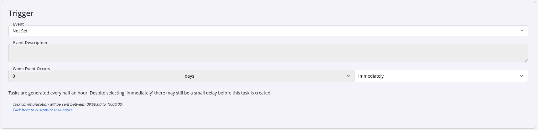 Choose when the task should fire relative to the event you’ve selected: before, after, or immediately.