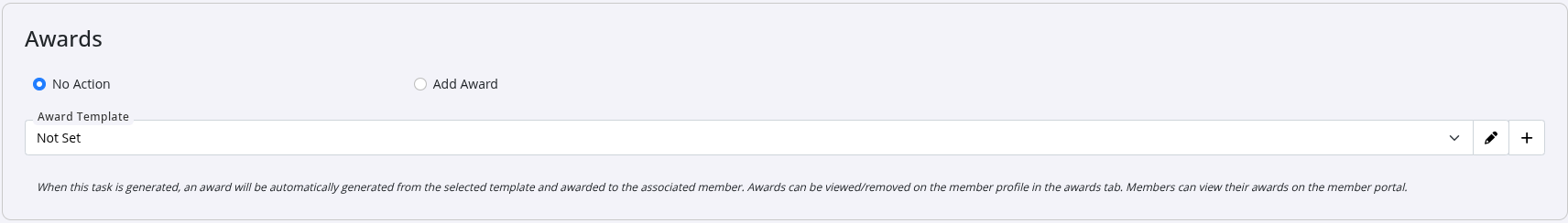 No Action: No award changes. Add Award: Automatically grant an award when the event occurs. Award Template: Select which award template should be applied.